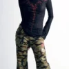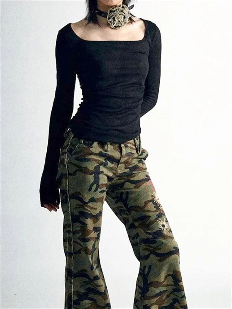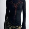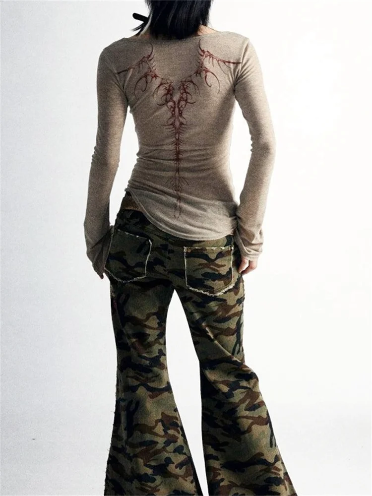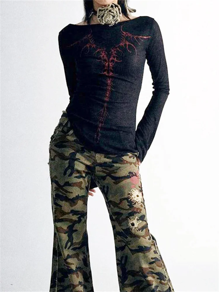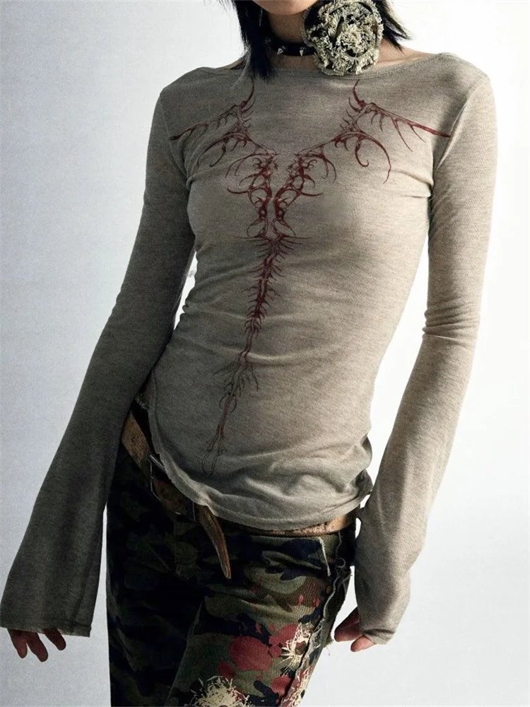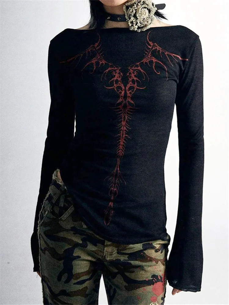 Women Long Sleeve T-Shirts Gothic Graphic Print Round Neck Shirts Spring Fall Slim Fit Casual Tops Streetwear