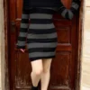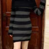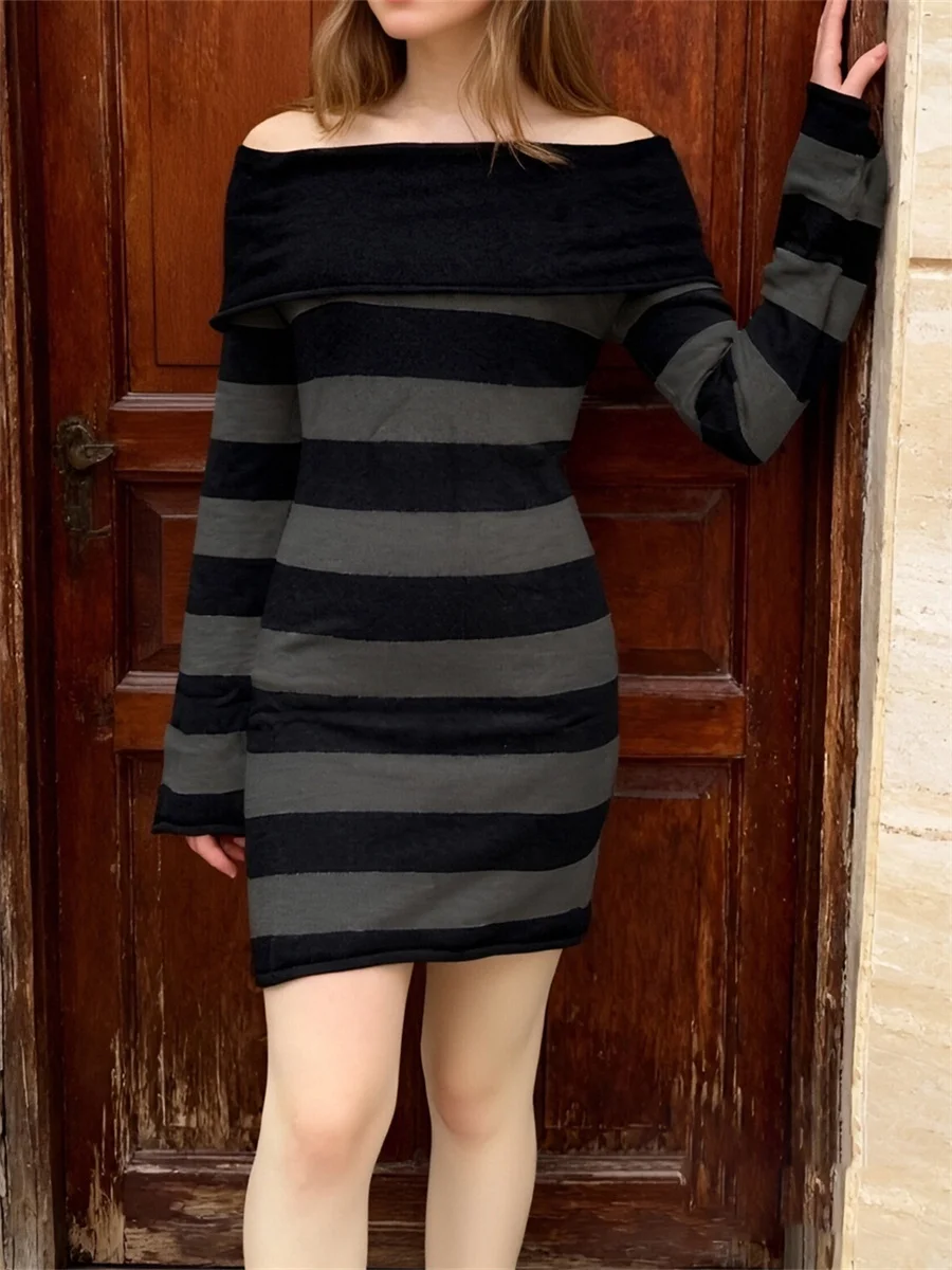 Womens Boat Neck Sweater Dress Striped Off Shoulder Long Sleeve Bodycon Mini Dress for Fall Winter Y2K Gothic Streetwear