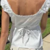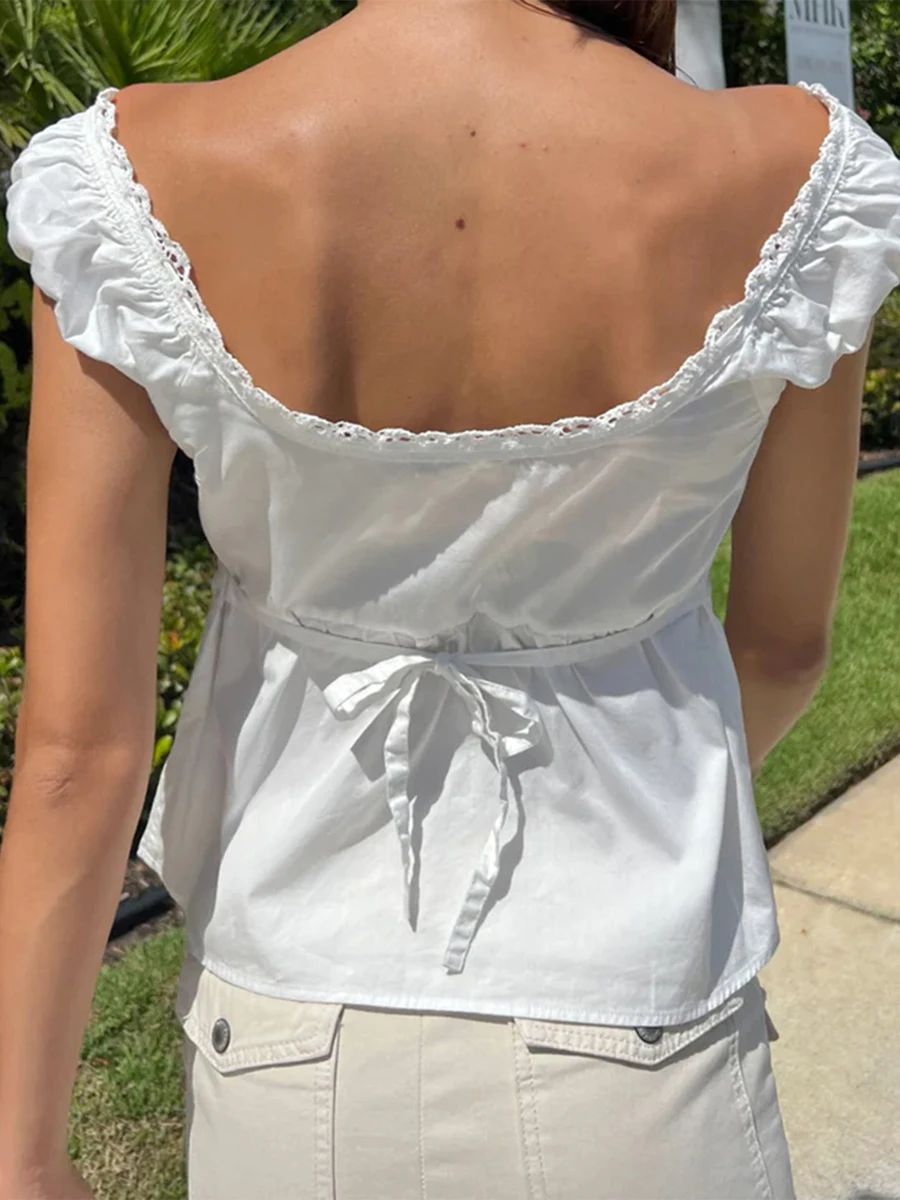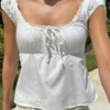 Women’s Cap Sleeve Tank Tops Solid Color Lace Trim Tie Front Bow Square Neck Blouse for Summer
