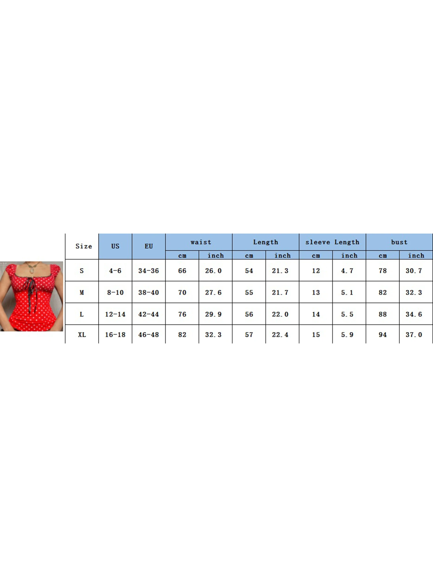 S Length: 54 Bust: 78 Waist: 66 Sleeve: 12