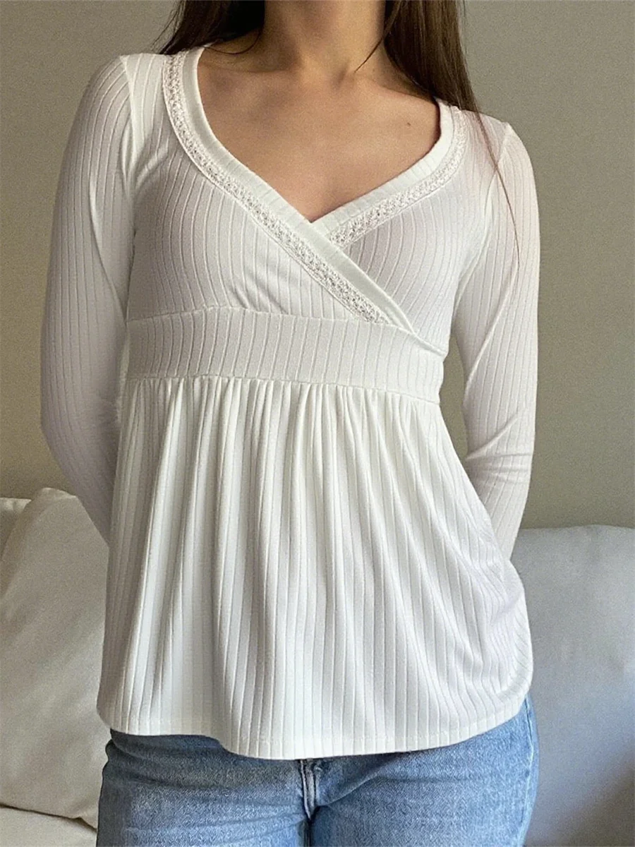 Women’s Fall Shirts Long Sleeve Solid Color Cross Wrap V Neck Going Out Babydoll Blouse