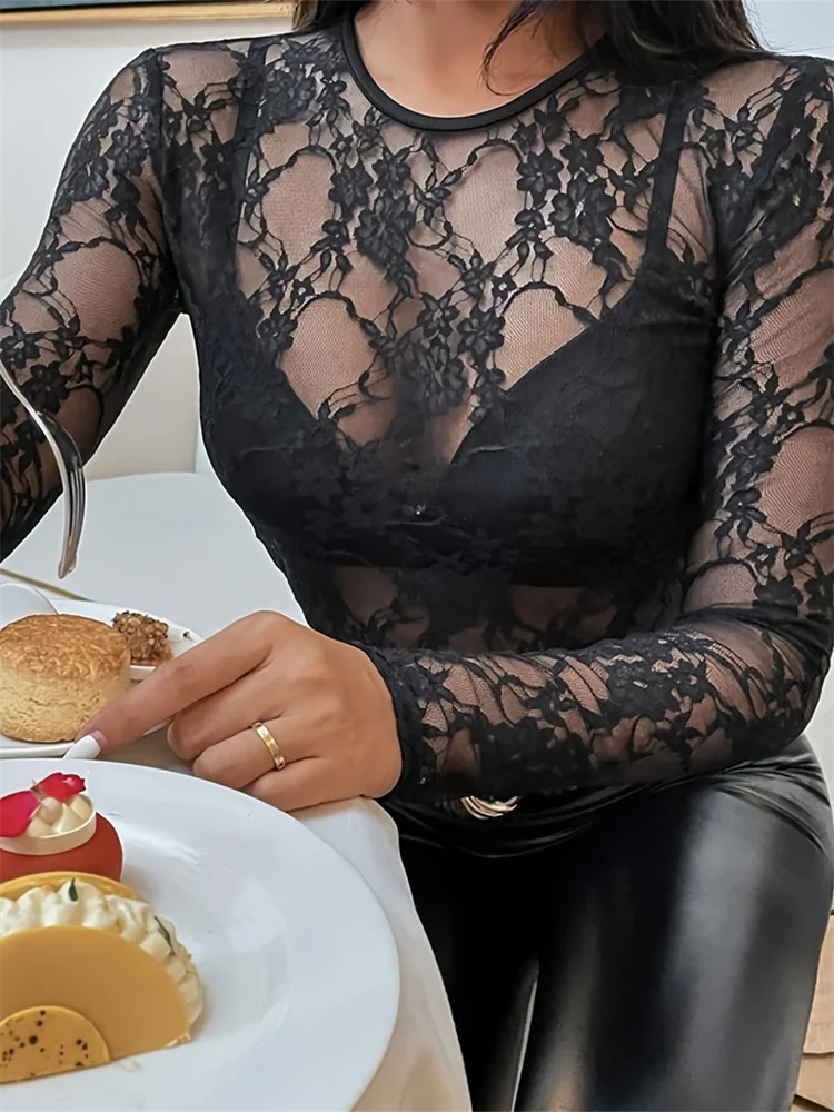 Women’s Spring Autumn Slim Tops Long Sleeve O Neck Sheer Lace Floral T-shirts