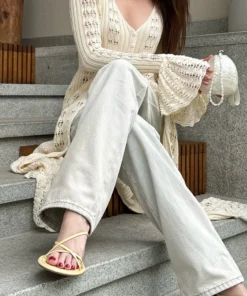 Women Knit Dress Long Sleeve Button Closure Cardigan Hollow Out Long Dress Top for Daily Street Summer Fall