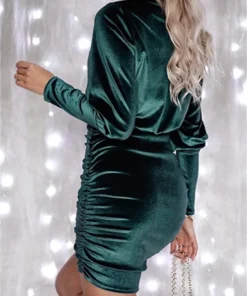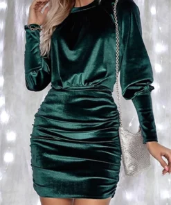 Women’s Fall Velvet Dress Solid Color Round Neck Lantern Long Sleeve Ruched Bodycon Mini Dresses Party Elegant