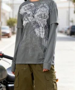 Women’s Tops Sweatshirts Long Sleeve Round Neck Grunge Graphic Print Loose Shirts Fake Two-Piece Streetwear Tops Fall