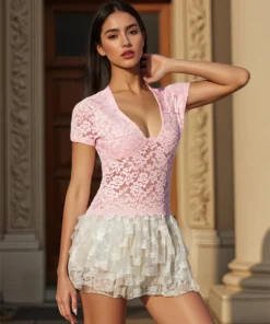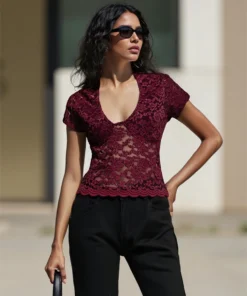 Women’s Summer Lace T-shirts Short Sleeve Deep V-Neck Sheer Mesh Slim Crop Tops Retro Corset Shirts Clubwear