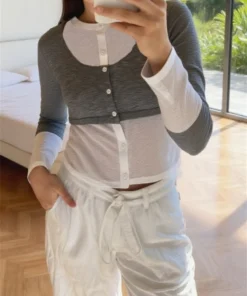 Women’s Fake Two-piece Tops Long Sleeve Contrast Color Button Up Blouse Spring Fall Knit Shirts