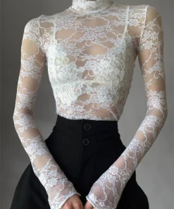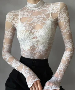 Women’s Lace Floral T-shirt Long Sleeve Mock Neck Lace Slim Tee Tops Summer Sexy Retro See Through Crop Tops