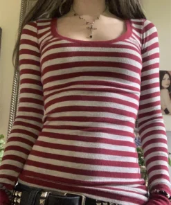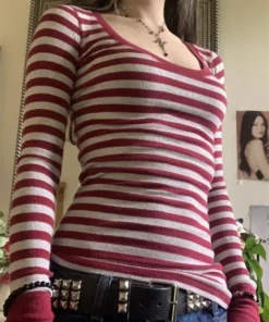 Women’s Fall Ribbed Tops Stripe Long Sleeve Scoop Neck Shirt Casual Slim Fit T-shirts